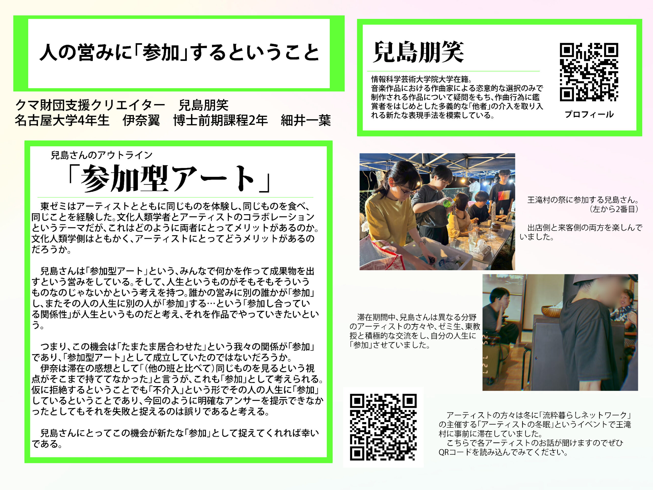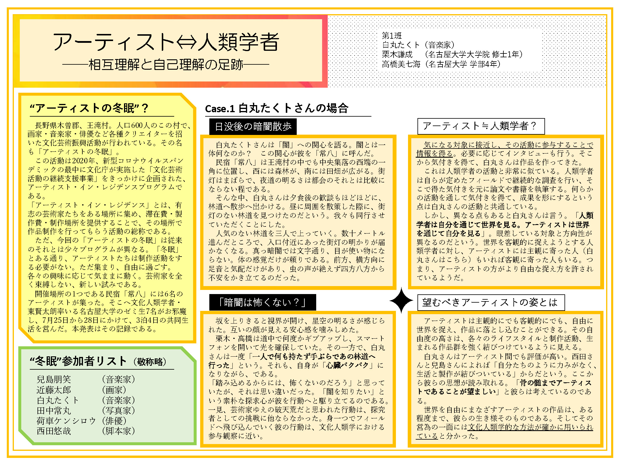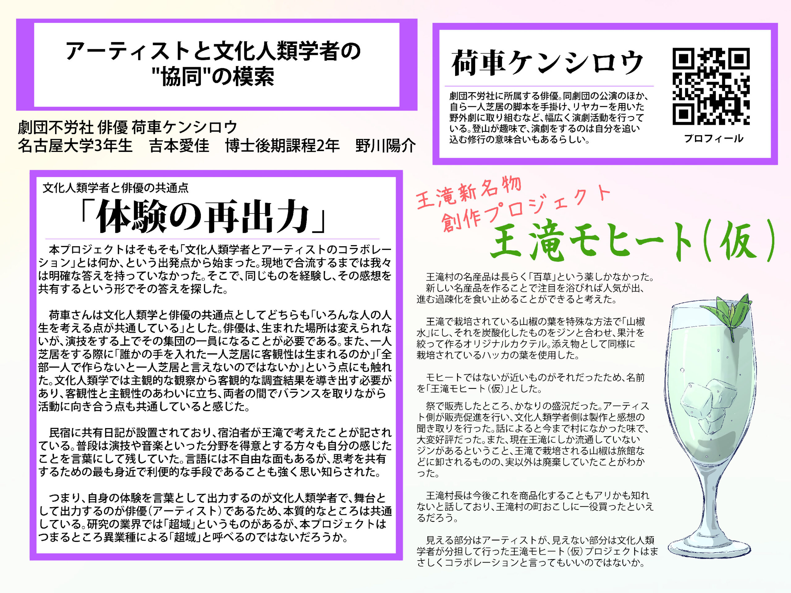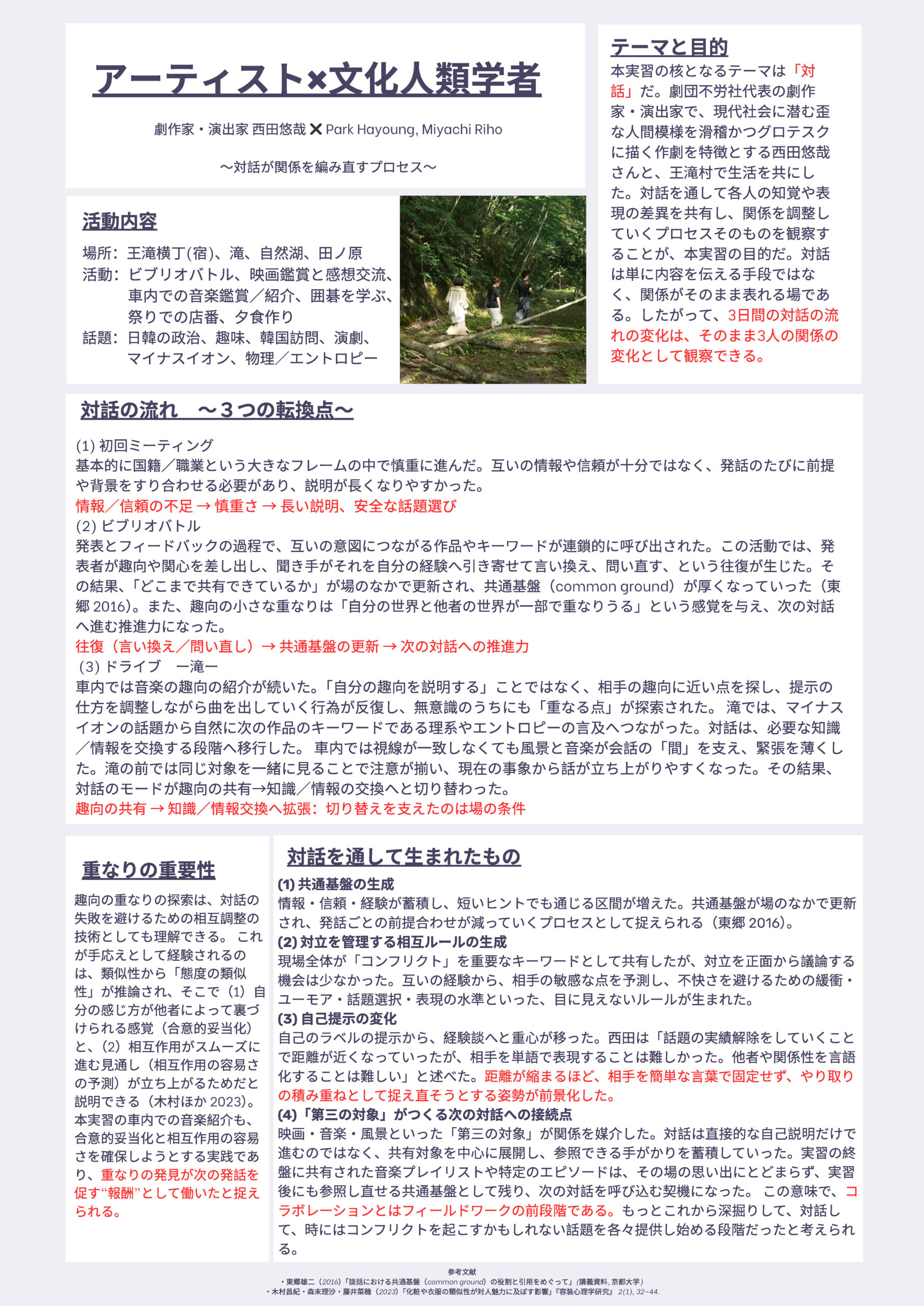 2025年7月25日~28日に実施した「土地と響きあう“粋”なコラボレーション」―文化人類学ゼミ×アーティストの王滝村探検」に参加した、文化人類学ゼミ学生によるポスター発表が行われました。ポスターを本サイトでも公開します。